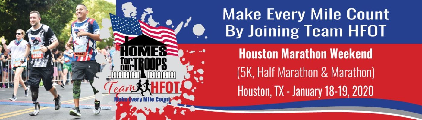Join Team Homes For Our Troops in the Houston Marathon Race Weekend January 18-19, 2020! Help raise awareness & funds for our mission to build and donate specially adapted custom homes nationwide for severely injured post-9/11 Veterans, to enable them to rebuild their lives.