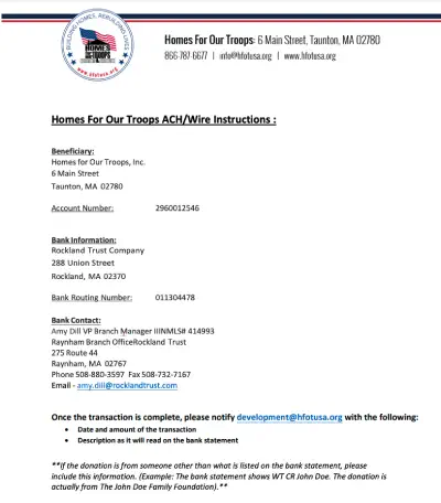 Please consider Homes For Our Troops in your Estate Planning options today. Remembering HFOT with a bequest from your estate will help sustain and strengthen HFOT in years to come. Contact Suzanne Shaheen, Gifts Officer by email at [email protected] or call 508-823-3300 ext. 241