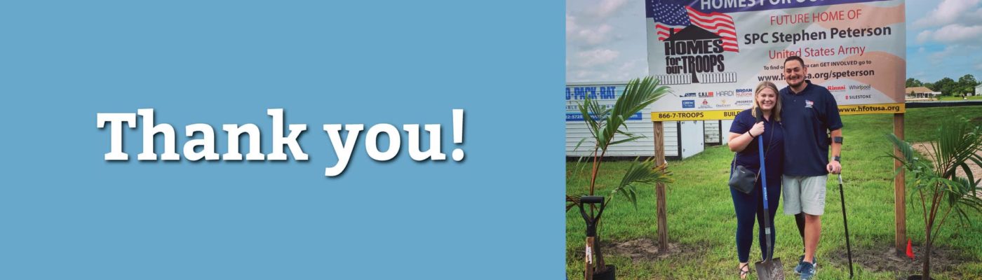 We hope you’ll join us in the future for Stephen and Brittany’s Volunteer Day and Key Ceremony, which we will hold in compliance with the safety directives of the CDC and Pasco County. Please be on the lookout for information on these events. In the meantime, we encourage you to spread the word about Stephen’s project and Homes For Our Troops.